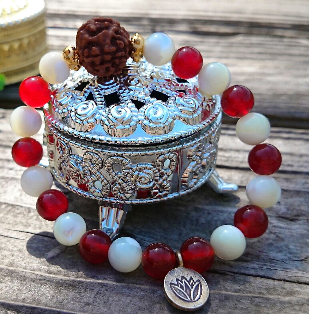 安産や子宝に効果があるといわれる大き目の6面のルドラクシャを中心に子宝や子育てのお守りとしても人気のマザーオブパール、絆を強めるといわれるレッドアゲートで作られたブレスレットです。